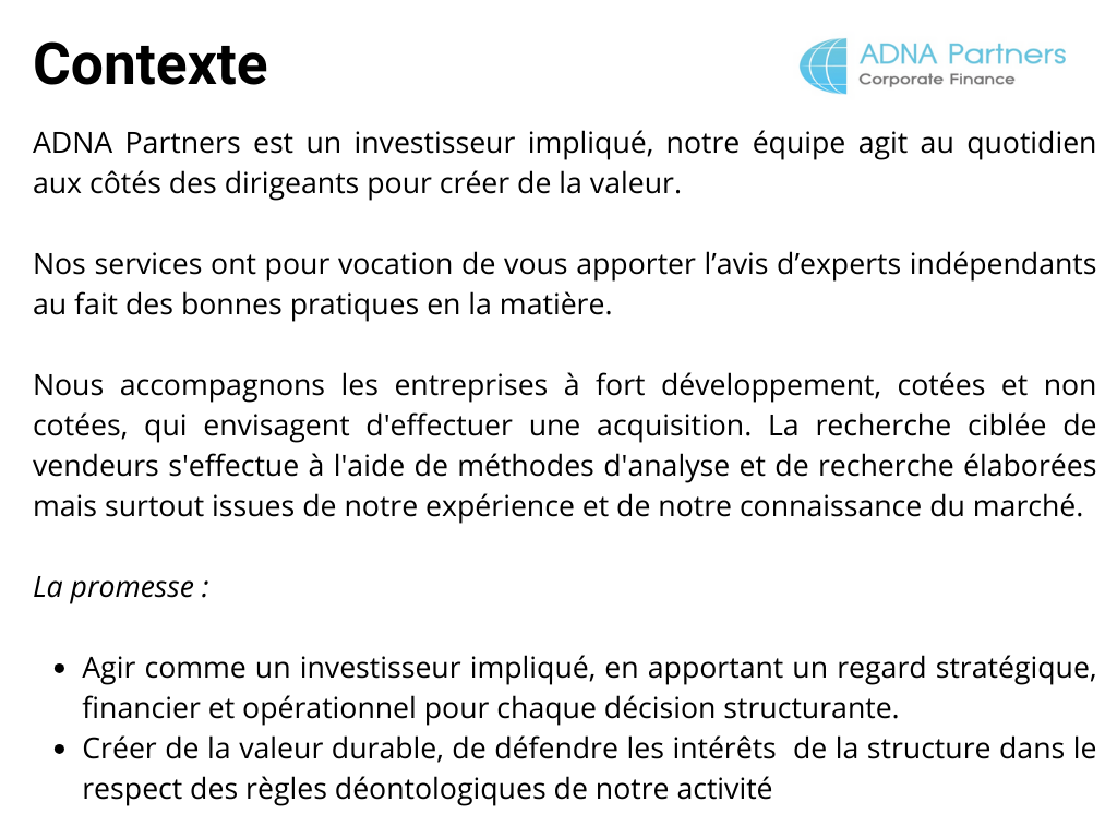 Au-delà des livrables, le travail réalisé a apporté une vraie clarté dans leur discours. ADNA Partners peut désormais expliquer son positionnement de façon simple et impactante, ce qui facilite les échanges avec ses interlocuteurs et améliore sa compréhension auprès de son écosystème.